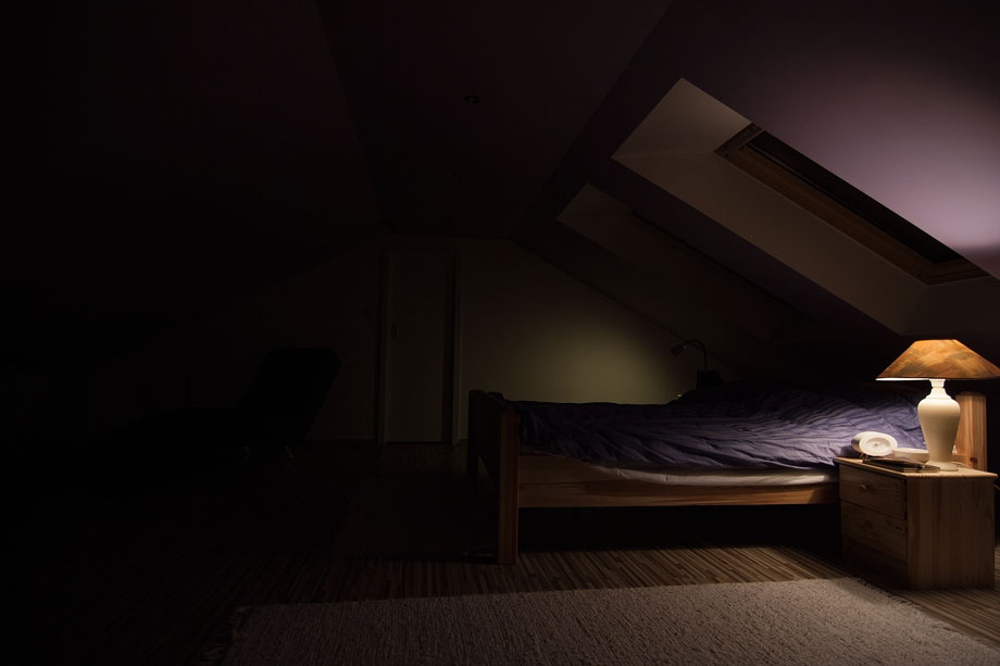 through a door open on half way. I like the dreamy to horror feeling. The depth